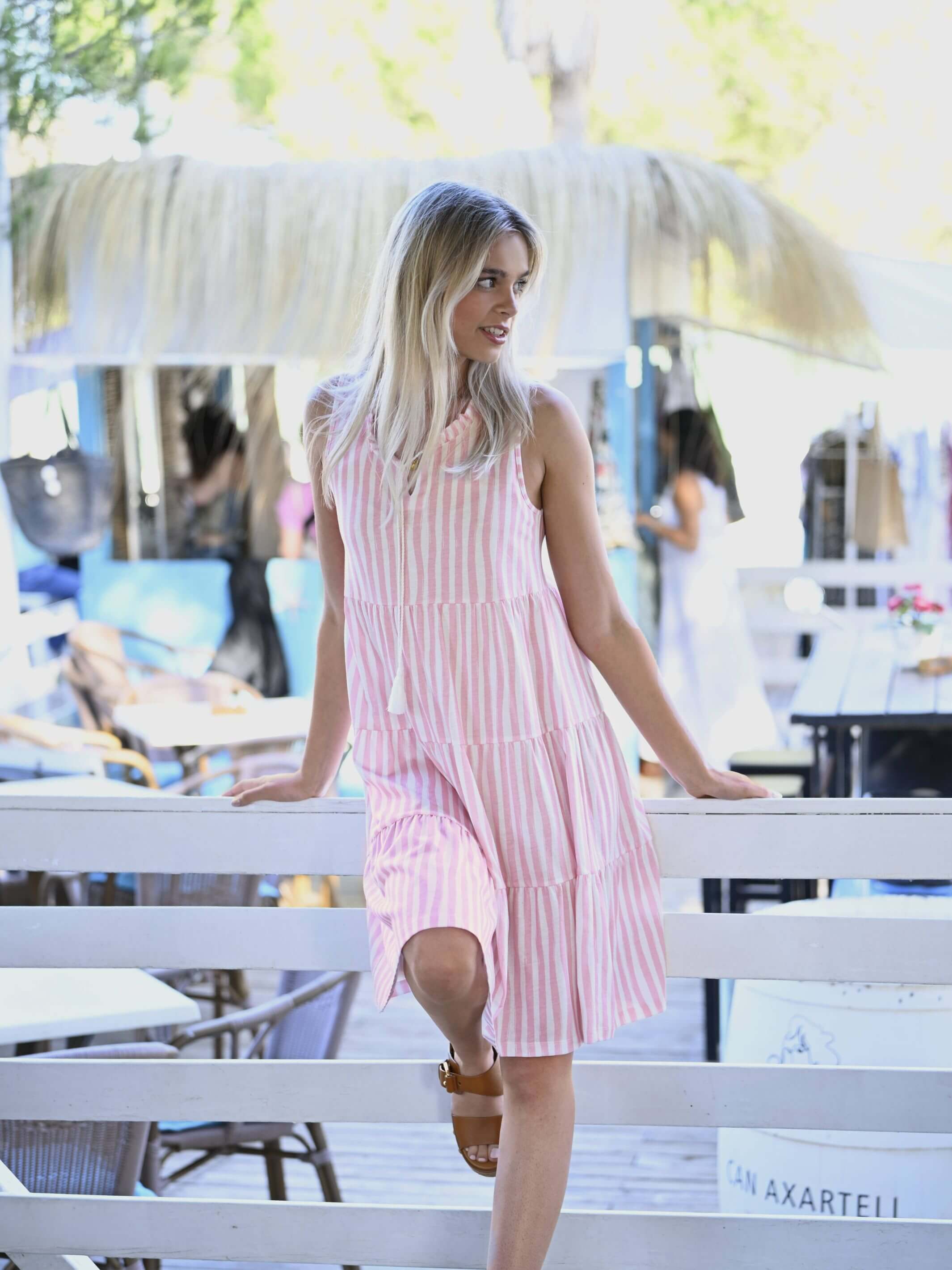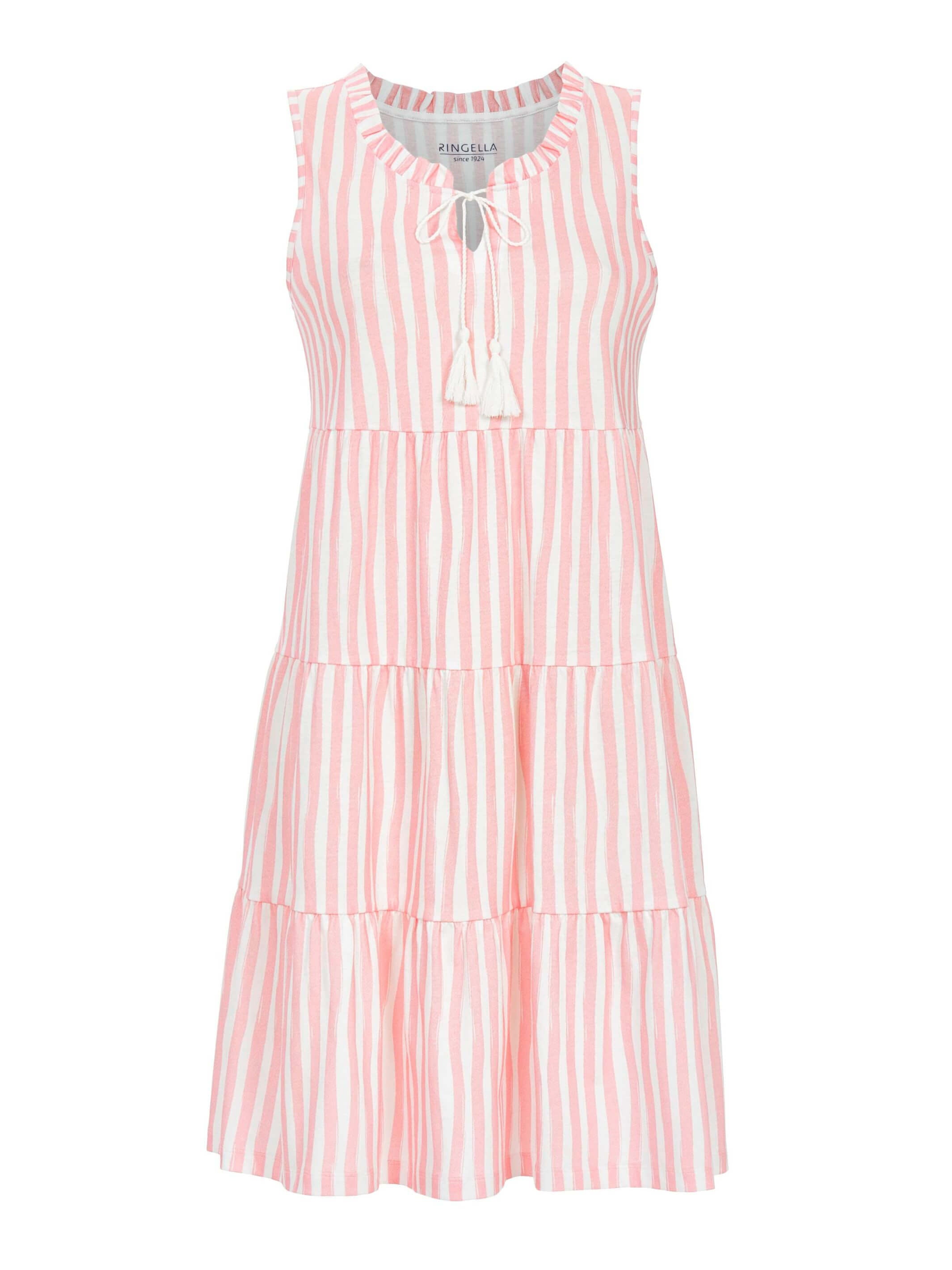 Ringellan ihana puuvillamekko. Tämä raidallinen mekko on monikäyttöinen, sillä sitä voi käyttää niin kesämekkona kuin yöpaitanakin. Mekossa on pyöreä pääntie, jossa solmittavat, hapsukoristeiset nyörit. Mekon helma levenee kerroksittain. Materiaali ohutta ja miellyttävän pehmeää puuvillaa. Pystysuuntainen raitakuosi, jossa vaaleanpunaista ja valkoista. Mekon pituus on 95 cm.